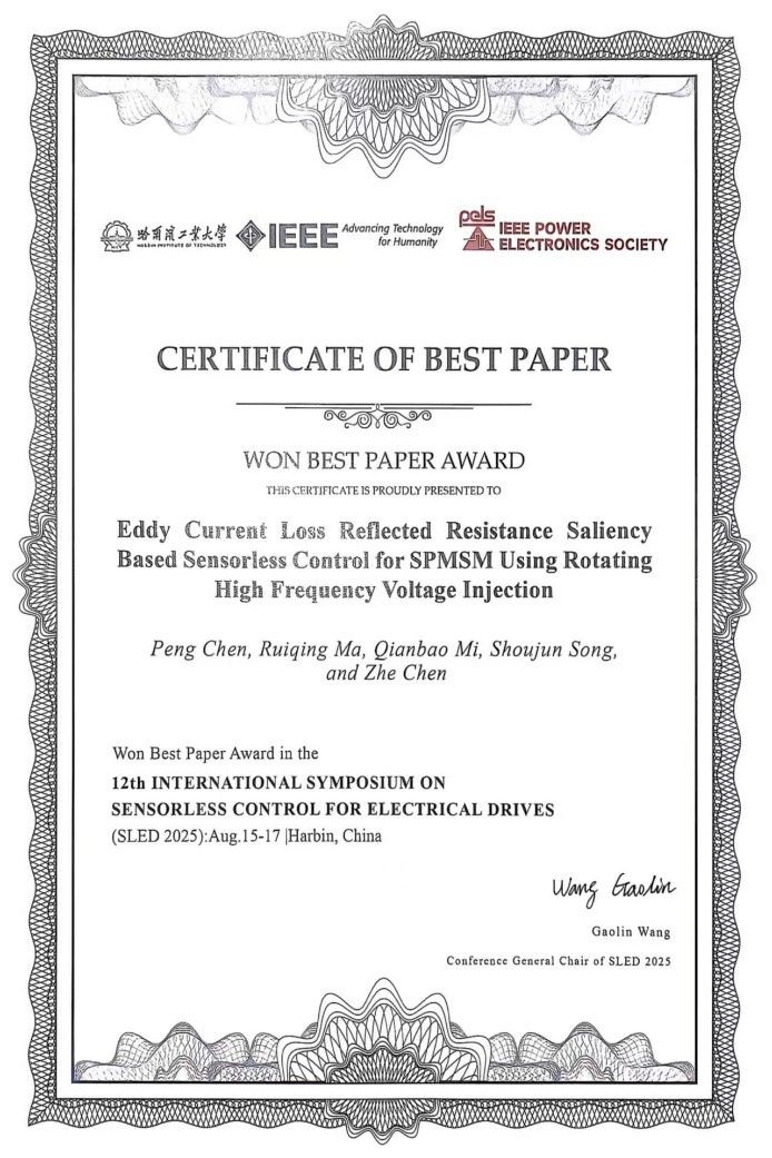 8月15日至17日,太阳成官网机电工程学院陈鹏博士参加第12届IEEE电驱动系统无传感器控制国际会议(SLED 2025),在分会场以《Eddy Current Loss Reflected Resistance Saliency Based Sensorless Control for SPMSM Using Rotating High Frequency Voltage Injection》为题作学术报告,获大会最佳论文奖。