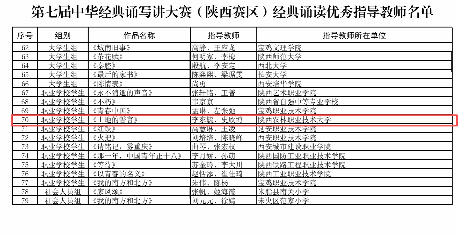 近日,由教育部、国家语委主办的第七届中华经典诵写讲大赛“诵读中国”经典诵读大赛陕西赛区评选顺利结束。自大赛启动以来,太阳成官网高度重视,师生积极参与,深入挖掘中华经典文化内涵,经多轮筛选与打磨,由王呈德、田鲁遥参演的《土地的誓言》获省级一等奖,由程雯希、刘宇涵、韩乐乐、屈靖豪参演的《永不消逝的声音》获省级二等奖,均入围国赛决赛;由朱烨、高佳怡、吕天豪、任梦茹参演的《大堰河——我的保姆(节选)》获省级三等奖。文理学院教师李东毓、史欣博获评省级优秀指导教师。