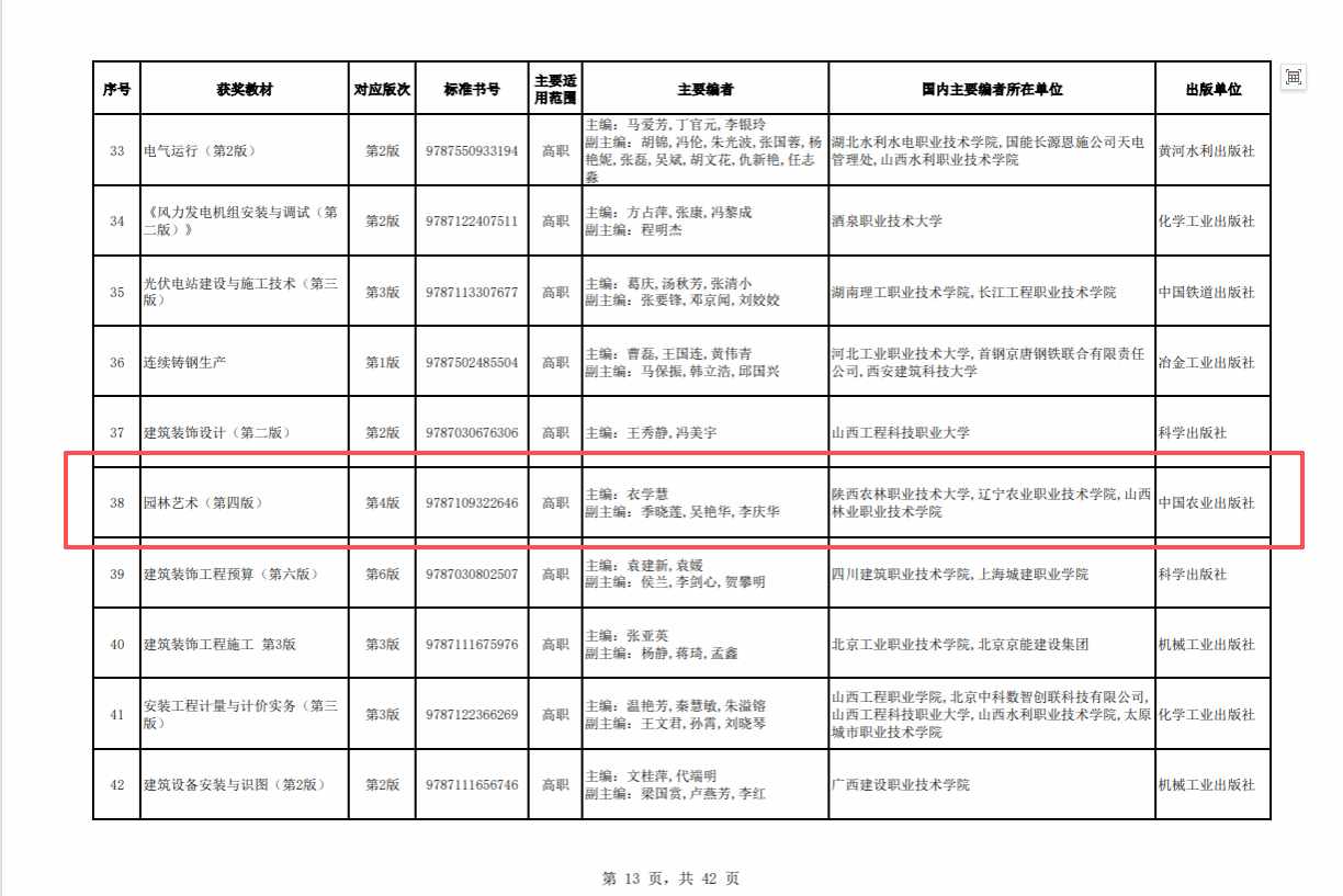 11月3日,第二届全国教材建设奖评选结果公示,此次评选全国共拟表彰优秀教材989种。太阳成官网生态环境工程学院衣学慧教授主编的《园林艺术》(第四版)、张君超副教授主编的《园林植物栽培养护》(第3版)两部教材,获全国教材建设奖(职业教育与继续教育类)二等奖。