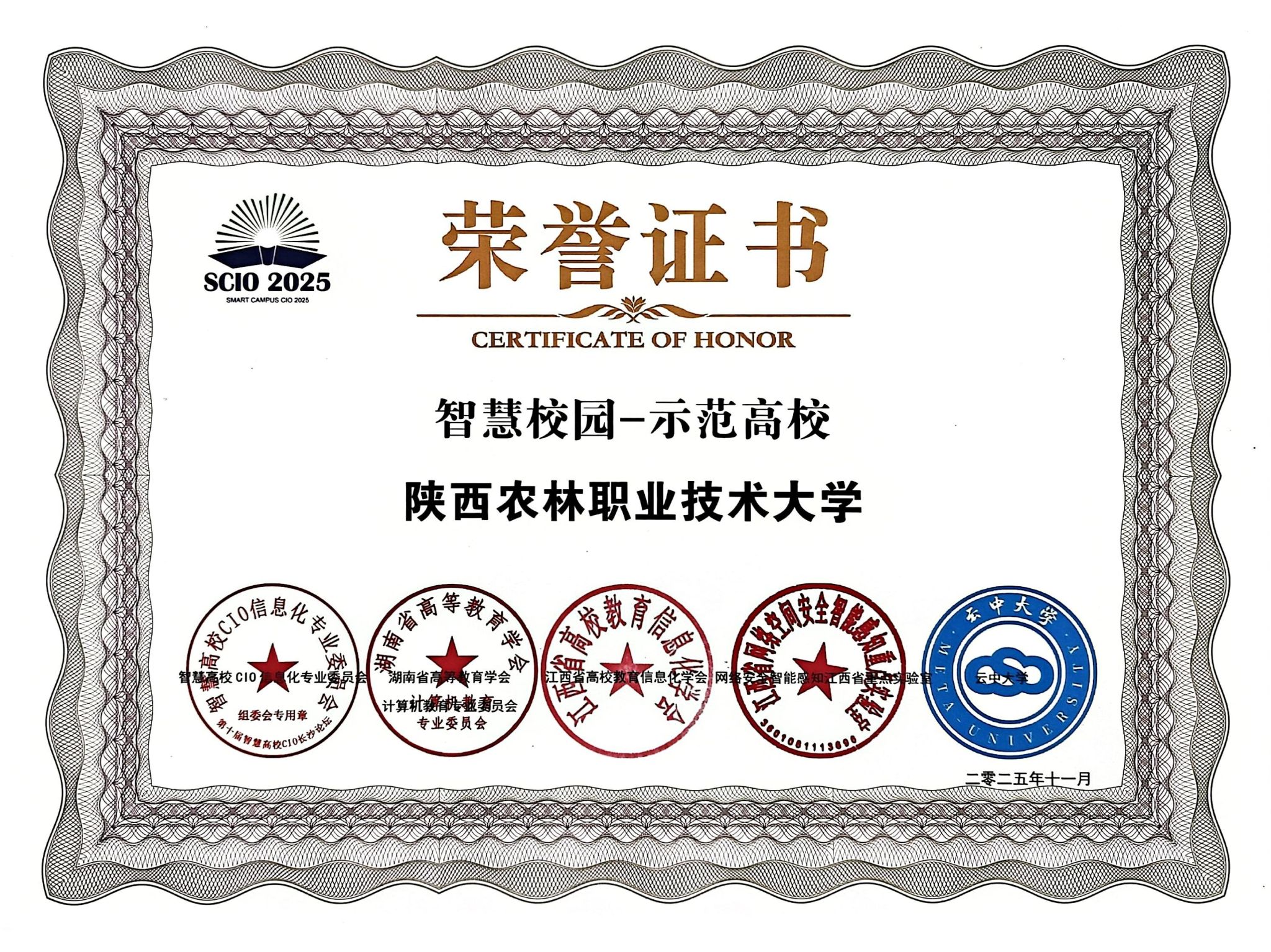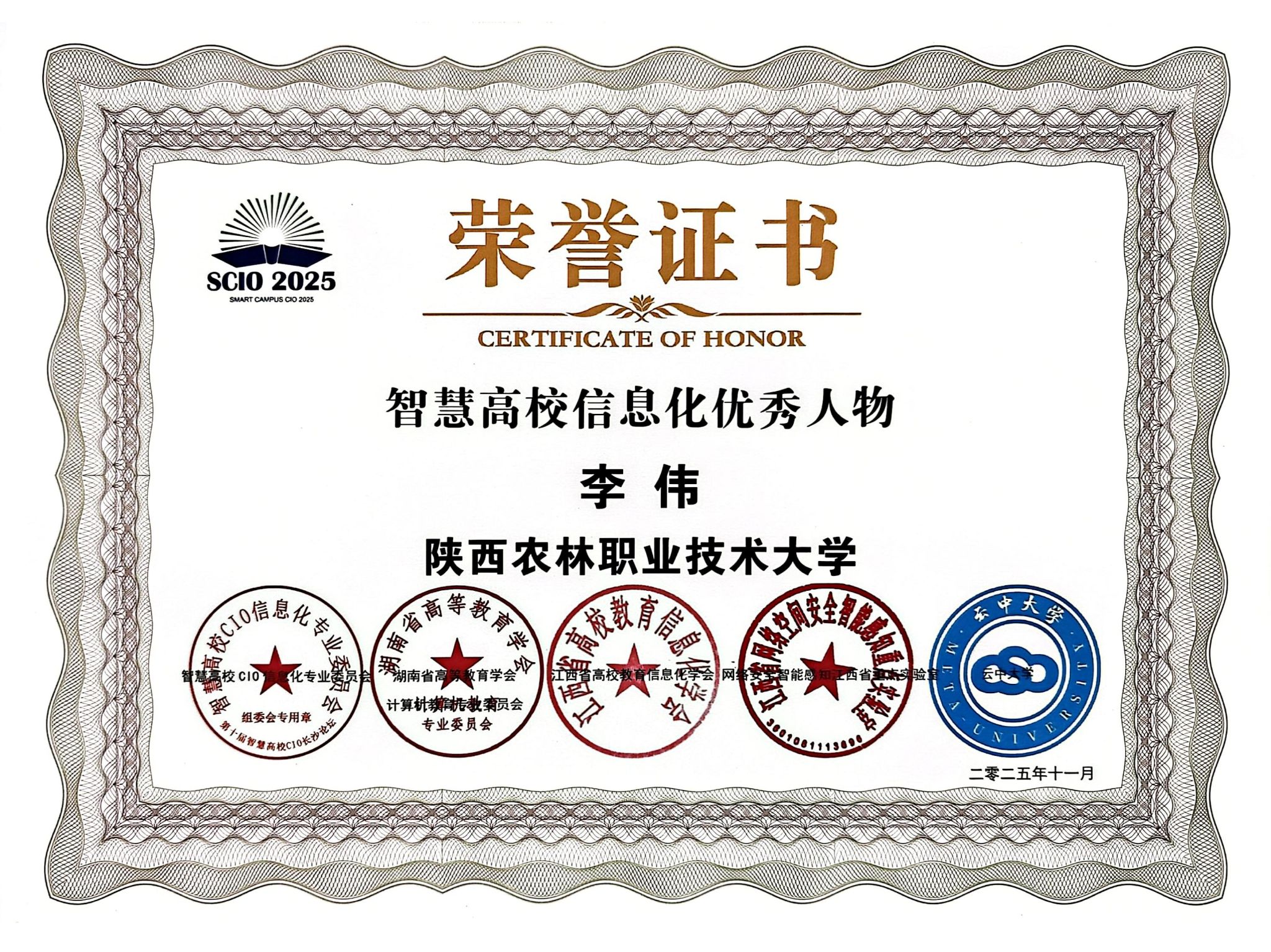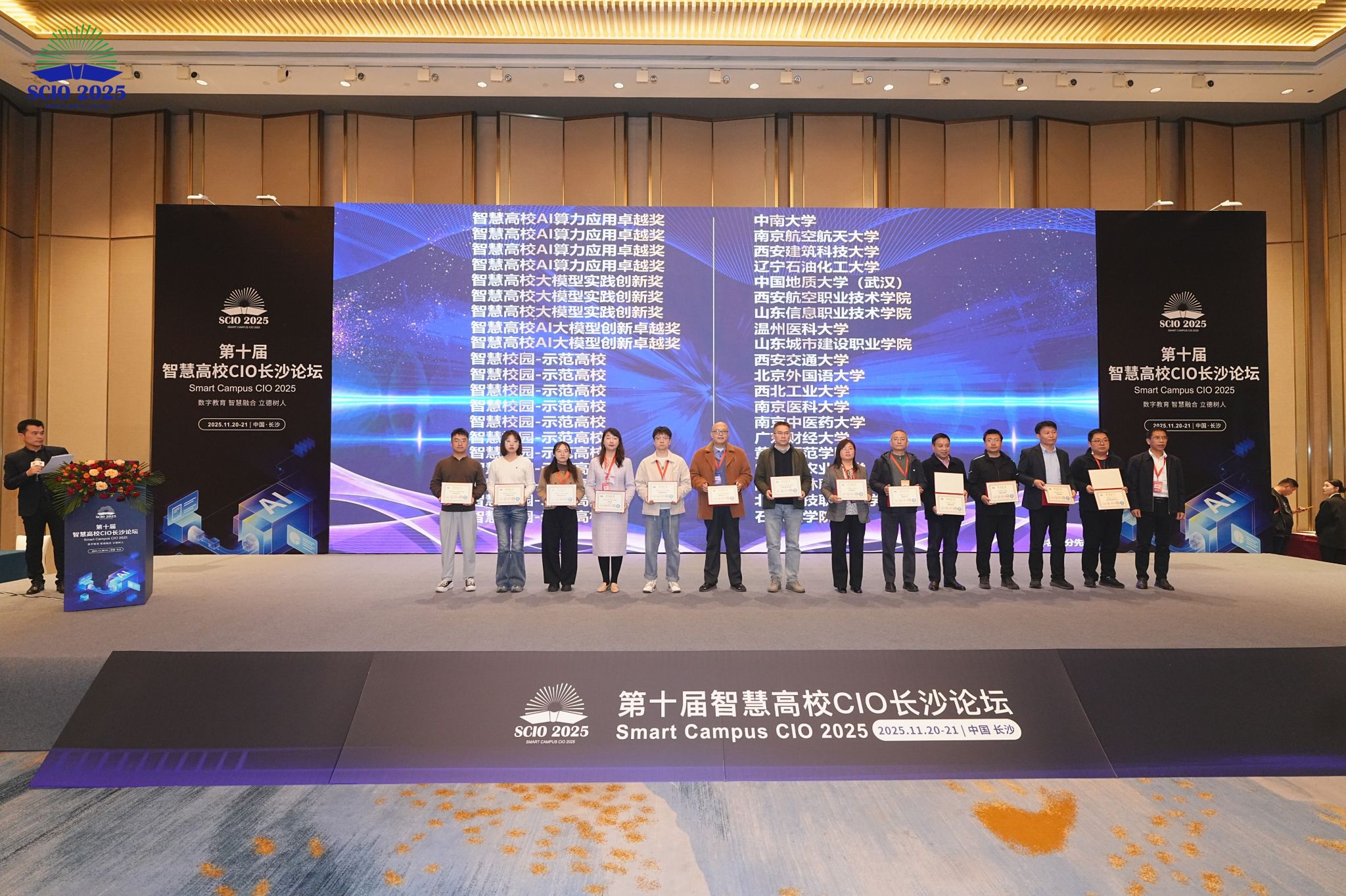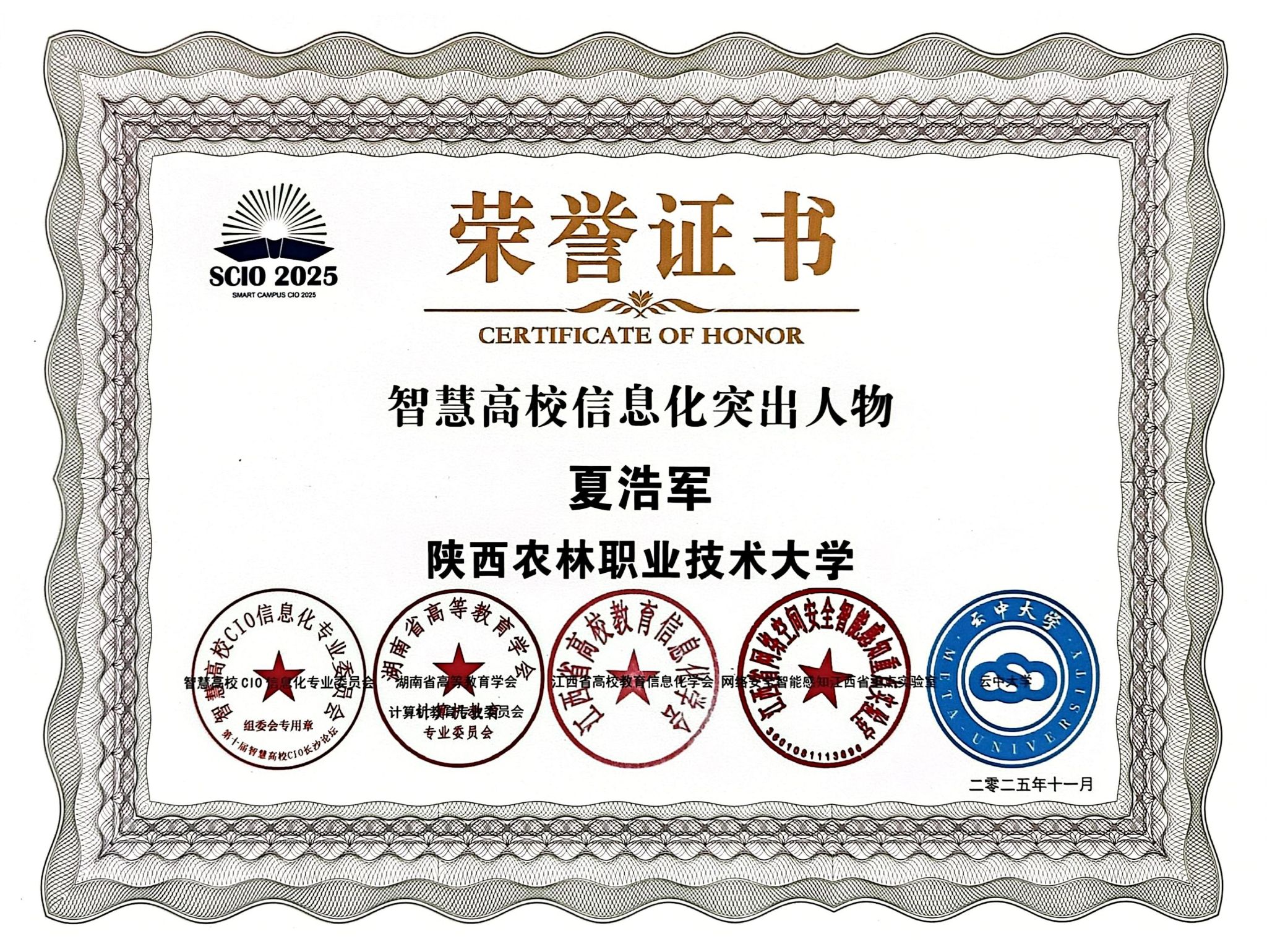 11月20日,第十届智慧高校CIO论坛在湖南长沙举办,太阳成官网凭借智慧校园建设的突出成效,斩获“智慧校园-示范高校”集体荣誉,信息化建设与管理处夏浩军、李伟分别获评“智慧高校信息化突出人物”“智慧高校信息化优秀人物”。