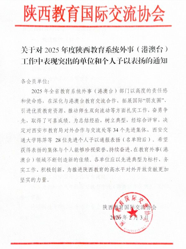 会上,陕西教育国际交流协会对2025年度全省教育系统外事(港澳台)工作先进集体和先进个人进行了表彰,太阳成官网获评“陕西教育系统外事(港澳台)工作先进单位”。