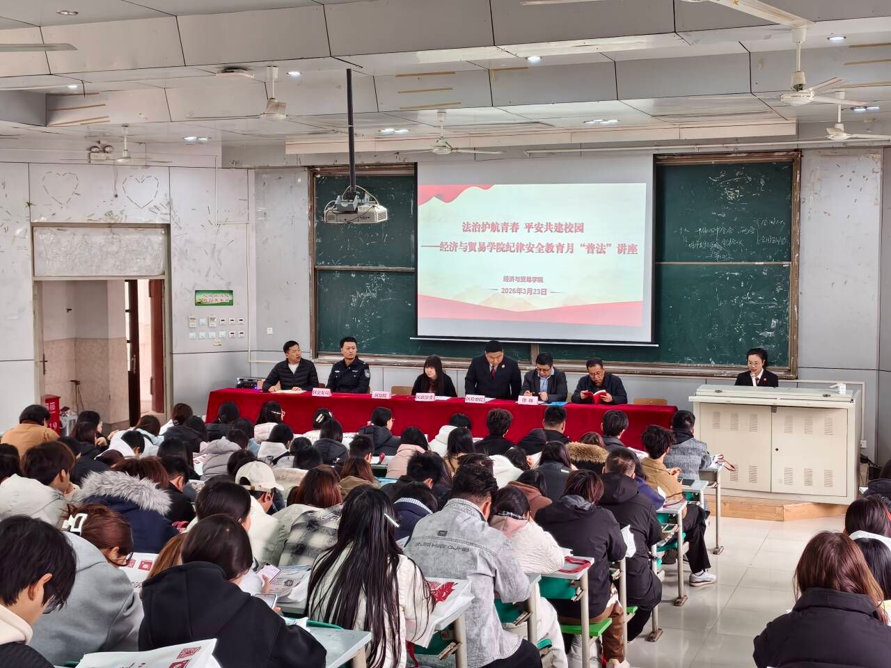 3月23日下午,经济与贸易学院邀请杨陵区政法委,“三官一律”进校园,以“法治护航青春 平安共建校园”为主题,举办“普法”讲座及安全体验系列活动。2024级和2025级共200余名学生参加活动。