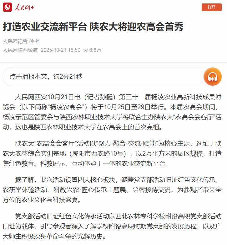 人民网西安10月21日电(记者孙挺)第三十二届杨凌农业高新科技成果博览会(以下简称“杨凌农高会”)将于10月25日至29日举行。本届农高会期间,杨凌示范区管委会与陕西农林职业技术大学将联合主办陕农大“农高会会客厅”活动,这也是陕西农林职业技术大学在农高会上的首次亮相。