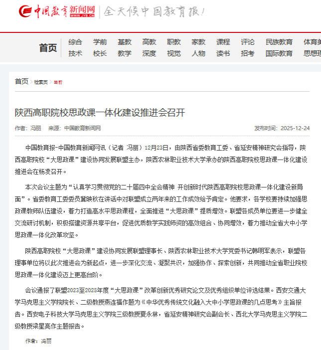 中国教育报-中国教育新闻网讯(记者 冯丽)12月23日,由陕西省委教育工委、省延安精神研究会指导,陕西高职院校“大思政课”建设协同发展联盟主办,陕西农林职业技术大学承办的陕西高职院校思政课一体化建设推进会在杨凌召开。